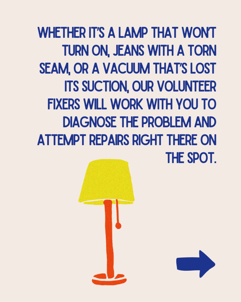 Fix-It Fairs are free community gatherings where neighbors help neighbors bring broken items back to life. We bring together skilled volunteers who love to fix things with community members who have items that need repair. Whether it’s a lamp that won’t turn on, jeans with a torn seam, or a vacuum that’s lost its suction, our volunteer fixers will work with you to diagnose the problem and attempt repairs right there on the spot.