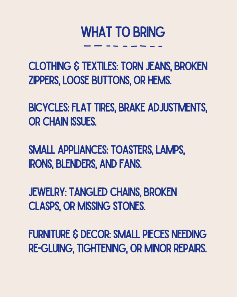 Because our community is full of knowledge and skills worth sharing. When we repair instead of replace, we’re not just fixing objects – we’re strengthening the connections between neighbors. Every Fix-It Fair is a chance to meet someone new, learn something you didn’t know, and contribute to a community that values mutual support.