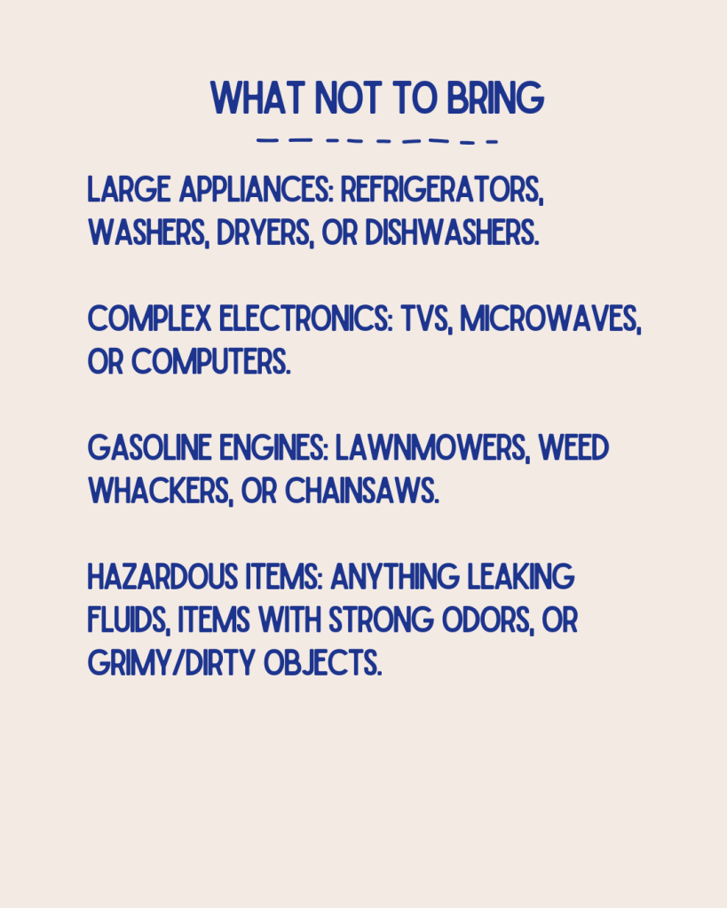 - Grimy, dirty, or hazardous items – please clean items before bringing them